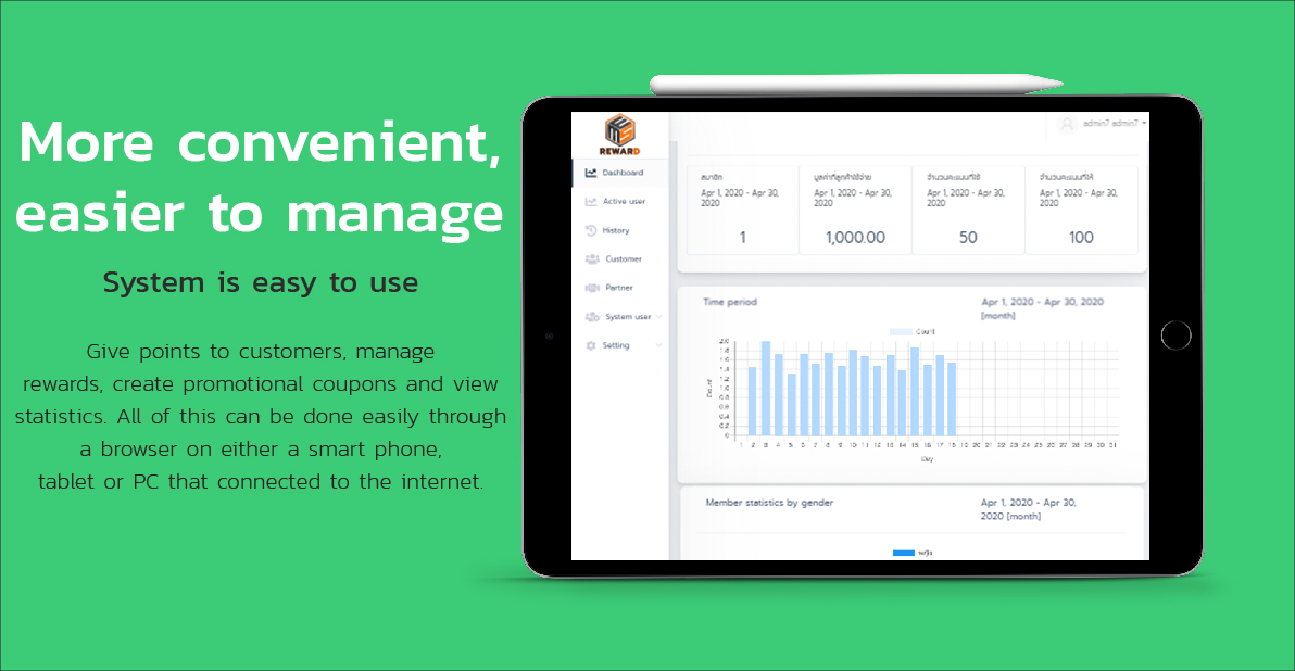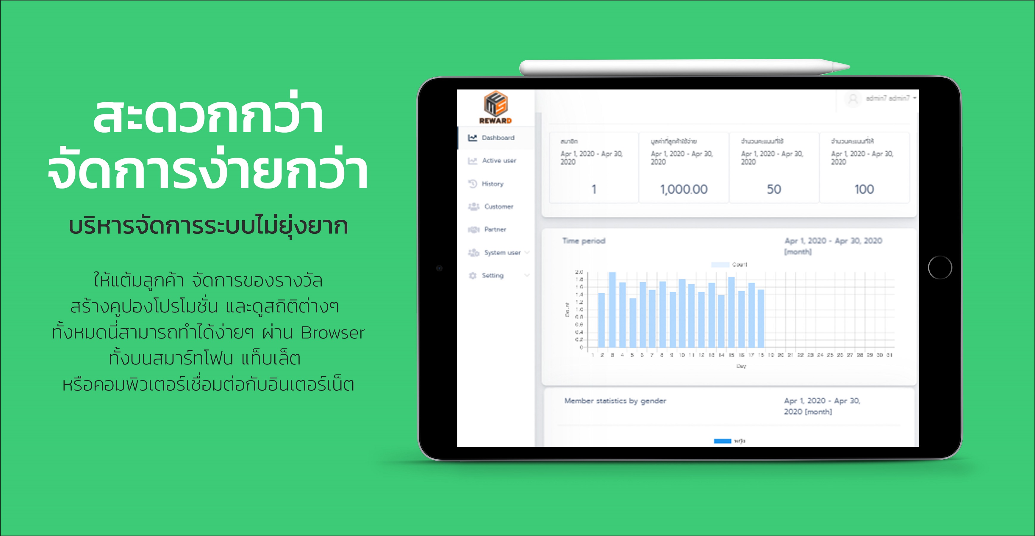 ให้แต้มลูกค้า, จัดการของรางวัล, สร้างคูปองโปรโมชั่น และดูสถิติต่าง ๆ ทั้งหมดนี่สามารถทำได้ง่าย ๆ ผ่าน App ทั้งบนสมาร์ทโฟน, แท็บเล็ต
